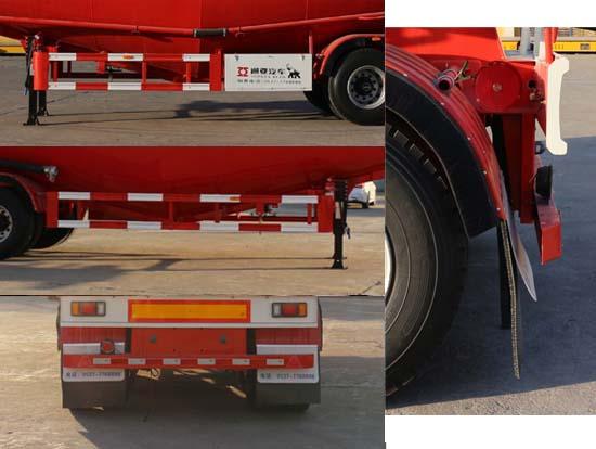 罐體總容量:50立方米,罐體有效容積:48.2;運輸介質:垃圾飛灰,最大介質密度:620千克/立方米,運輸車輛類型為AT,類項號:9;選裝前部加裝機組時外形尺寸(mm)為:11400,11150×2550×4000,罐體外形尺寸:罐體長(含封頭)10350mm,寬2550mm,高3350mm,最小封頭直徑為:2010mm,選裝罐體尺寸(含封頭)長為:10600mm,寬2550mm,高:3350mm,最小封頭直徑為1960mm;選裝后部燈具可以為圓形,選裝大梁后部可以為弧形,選裝爬梯的安裝位置可以在罐體左側前部或后部或罐體后部,爬梯個數可以為一個或兩個或三個,選裝走臺樣式,選裝罐頂升降護欄,頂部可為擋水槽式也可為走臺式,選裝前后封頭處進氣管位置和個數,工具箱位置可選裝,選裝大梁可以鉆孔,選裝罐體管道的樣式,選裝機組樣式;該車加裝空氣懸架,安裝盤式制動器;EBS系統生產廠家:廣州瑞立科密汽車電子股份有限公司;EBS型號:CM-TEBS;側面及后下部防護裝置所用材料材質為:Q235,側防護連接方式為:螺栓連接,后防護連接方式為:焊接,后部防護裝置的主要尺寸參數:斷面尺寸(mm)為120×68,離地高度為:500mm.罐體頂部封閉不可開槽,后部不可開啟,牽引車采用適用于牽引危險品運輸半掛車的牽引車;車長/牽引銷到車輛最前端距離/軸距/后懸的對應關系為:11400/1250/6650+1310+1310/880,11400/1350/6550+1310+1310/880,11400/1550/6350+1310+1310/880,11150/1000/6650+1310+1310/880,11150/1100/6550+1310+1310/880,11150/1300/6350+1310+1310/880,10600/450/6650+1310+1310/880,10600/550/6550+1310+1310/880,10600/750/6350+1310+1310/880,10500/700/6350+1310+1310/830. |