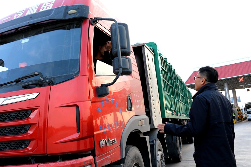 ETC發(fā)行工作人員向貨車司機宣傳辦理記賬式貨車ETC的好處。