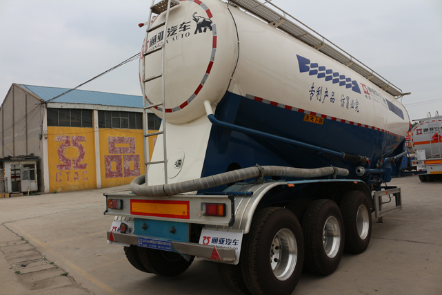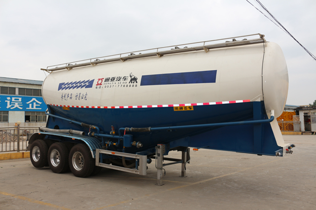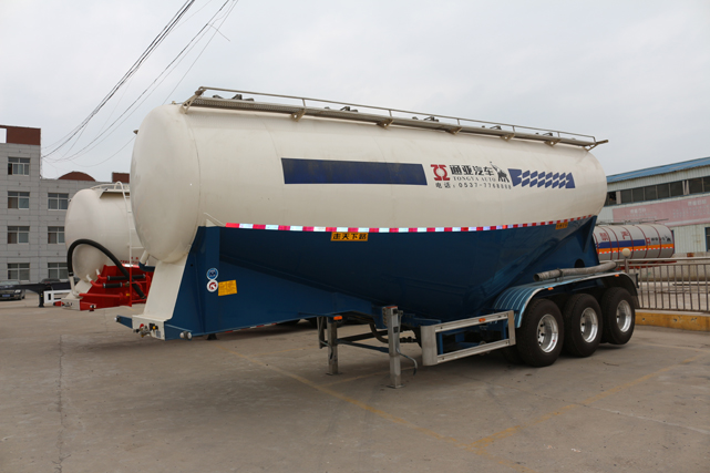 通亞汽車自去年11月份多次考察市場后發現目前中國市場中存在一些比較特殊的運輸貨物,此類貨物由于流動性差迫使客戶需要使用普通欄板半掛車、倉柵半掛車或者立式粉罐半掛車來運輸。使用普通半掛車運輸既拉的少卸料又需要人工而且運輸及卸料途中還污染環境,費時費力,是最差的一種運輸方式。由于國家現在嚴查環保普通半掛車運輸將逐步會淘汰。立式粉罐半掛車雖說卸料干凈但是自重重、不美觀,而且價格太高。這就導致了客戶運輸成本升高、收入降低。通亞汽車本著全心全意為客戶服務的理念、為客戶創造更高利潤的想法,歷時數月并多次實驗而研發出了輕型粉罐半掛車新產品----臥式顆粒運輸專用車。